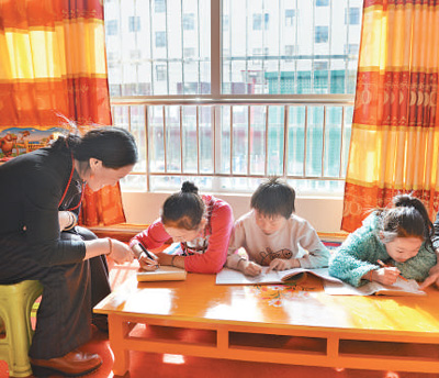 | 西夏的妻子拉吉在新房里给孩子们辅导功课。 黄海兰摄 |