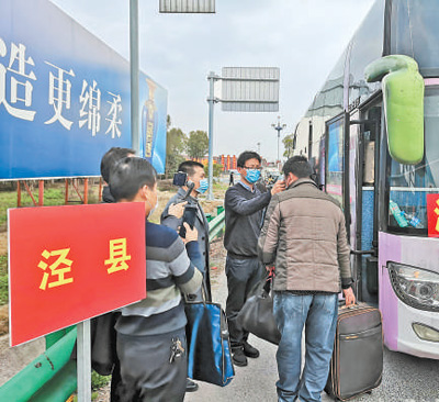 | 2月25日,安徽泾县统一包车送务工人员去宣城。 袁庆华摄 |