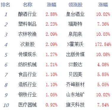 从盘面上看,板块涨多跌少,白酒、网游、汽车、农业、医药疫苗、电力等板块居涨幅榜前列;海南、新零售、半导体、水泥、光刻胶等板块居跌幅榜前列。