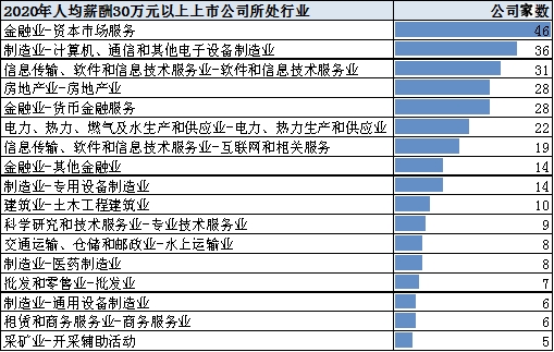 在这347家上市公司中,从事“金融业-资本市场服务”行业的公司数量最多,达46家,其中中金公司、华泰证券、招商证券2020年人均薪酬分别达114.97万元、92.71万元、81.24万元。