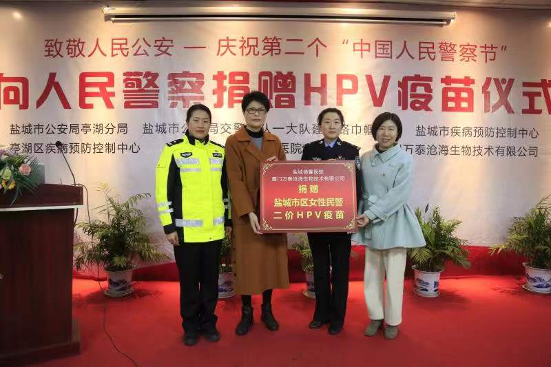 1月10日是第二个"中国人民警察节",盐城市公安局亭湖分局、盐城市公安局交警支队一大队建军路巾帼中队和盐城德馨医院共同举办“向人民警察捐赠宫颈癌疫苗”活动。活动得到了盐城市疾控中心、亭湖区疾控中心和厦门万泰沧海生物技术有限公司的支持。