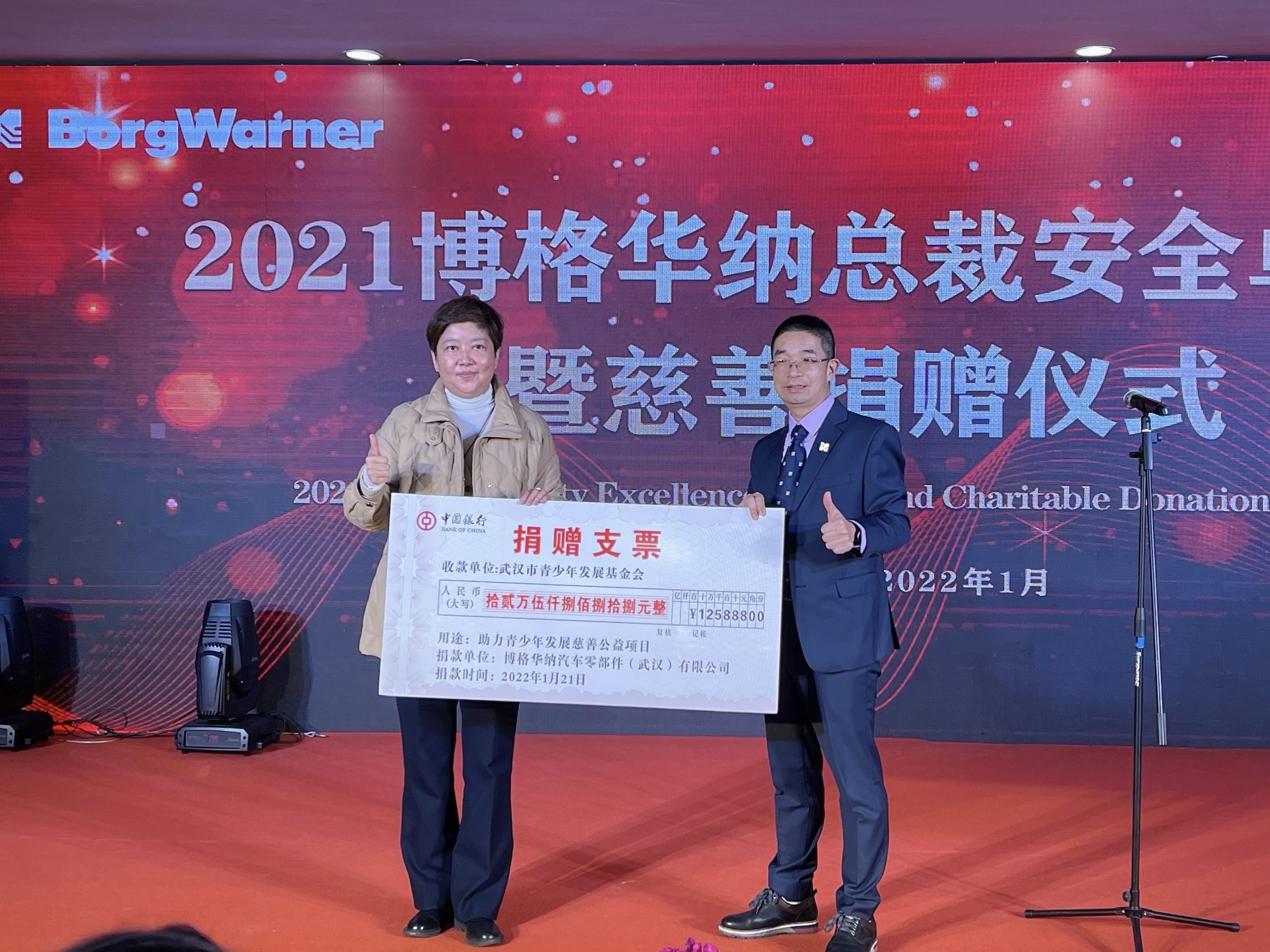 博格华纳汽车零部件(武汉)有限公司总经理张新发介绍,12.58万元来自今年公司获得的博格华纳总裁安全卓越奖奖金。工厂累计一百万个工作小时无可记录工伤事故发生,才能获得博格华纳总裁安全卓越奖,这也是博格华纳总公司设立的最高安全奖项。“我们将奖金捐给武汉市青少年发展基金会,用于回馈社会,关爱蔡甸区困境学生,为蔡甸区青少年成长发展做出积极贡献。”