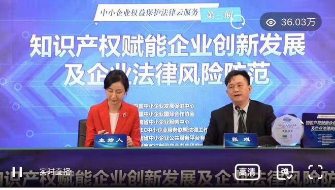 3月17日,“知识产权赋能企业创新发展及企业法律风险防范”公益讲座在湖南省中小企业服务中心进行了网络视频直播,此次公益讲座由国家工信部中小企业发展促进中心指导,湖南省中小企业服务中心、APEC中小企业服务联盟法律工作委员会主办。湖南省高级人民法院伍胜高级法官和湖南国简律师事务所张琪主任律师分别以知识产权赋能企业创新发展和企业法律风险防范为主题,进行了专题讲座。全国各省窗口平台、核心服务机构、“专精特新”小巨人企业等共41万人次参加了视频听课,在线听课的中小企业家朋友与网友达四十余万人,就知识产权的形态特征,保护的作用与意义,企业法律风险的防范进行了深入浅出的宣讲,此次公益讲座取得了圆满成功。