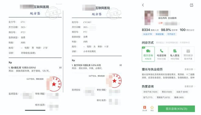 线上接诊医生询问“为什么要用这个药物”,半月谈记者回答“皮肤局部麻醉”,5分钟内即获得了银川某互联网医院的处方签。值得注意的是,这份处方签与半月谈记者此前购买维A酸乳膏时获得的处方签,医师、审核调配、核对发药3人的签名完全一致。