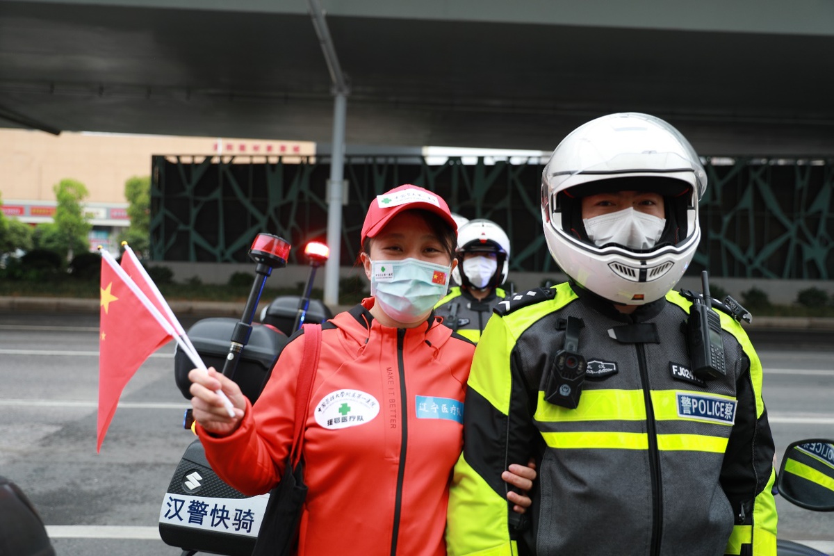 (图为辽宁援鄂医疗队队员与交警合影留念。 摄影 苏峰)