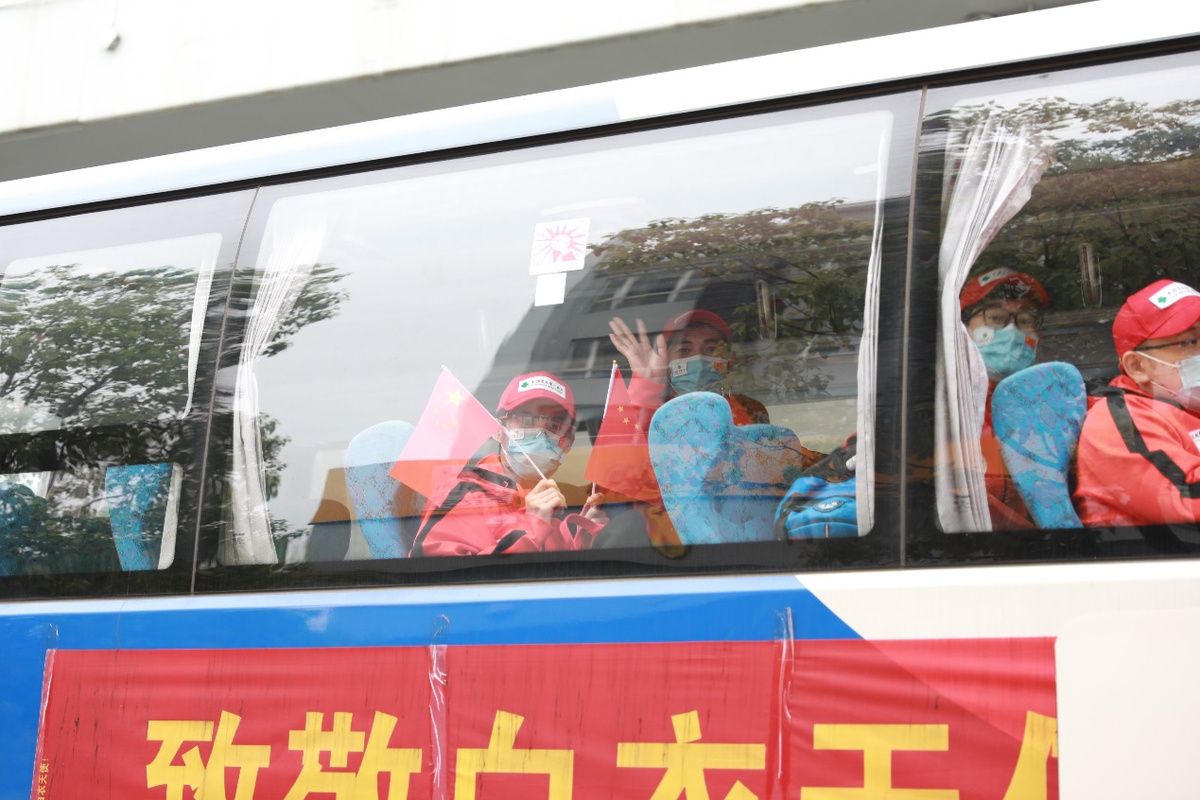 (图为辽宁援鄂医疗队队员挥手道别。摄影 苏峰)