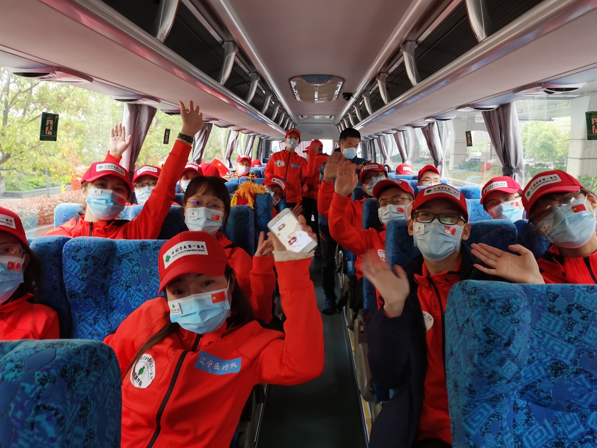 (图为辽宁援鄂医疗队队员挥手道别。摄影 吴勇)