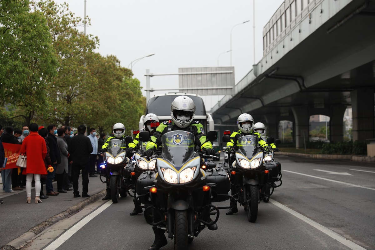 (图为护送辽宁援鄂医疗队队员前往机场的武汉交警。 摄影 苏峰)