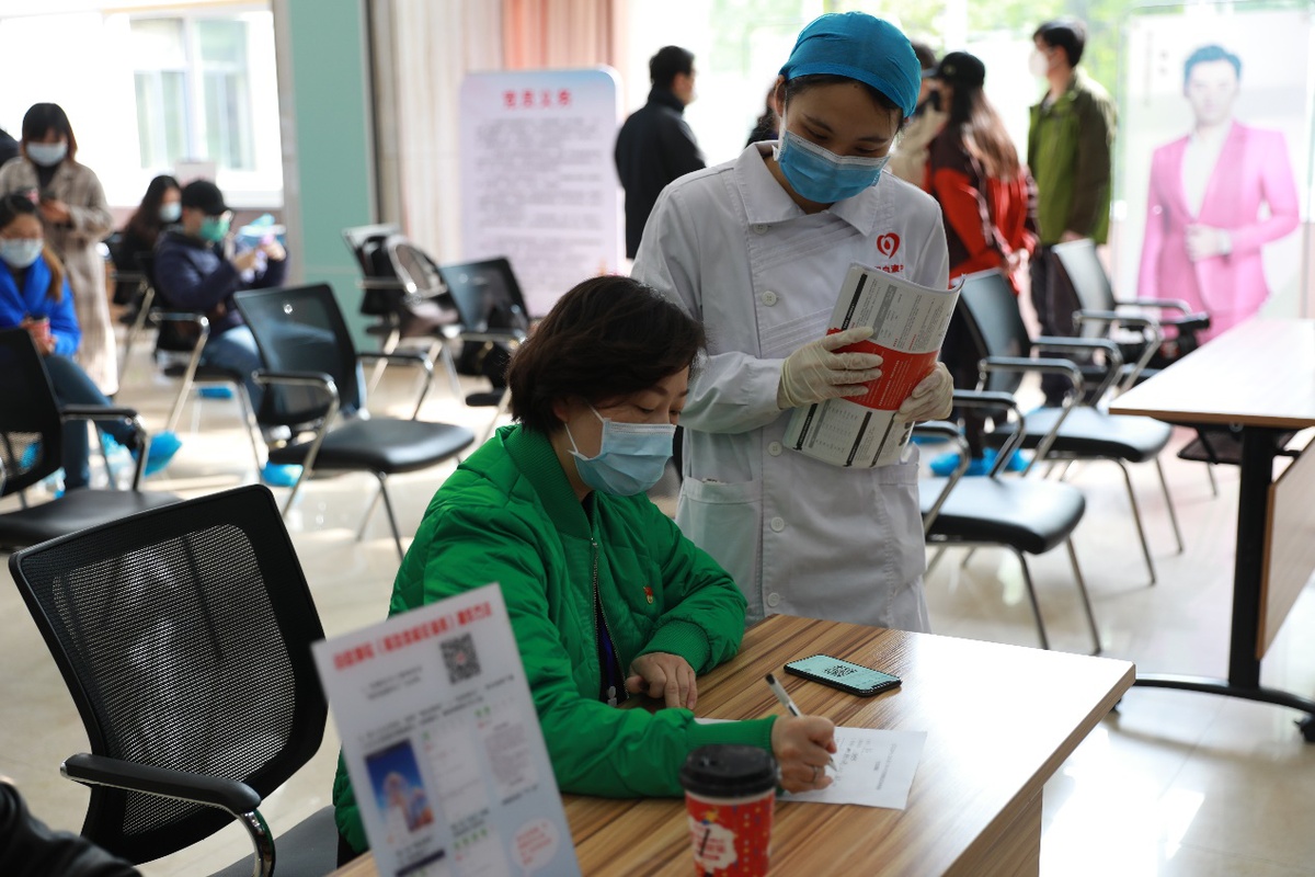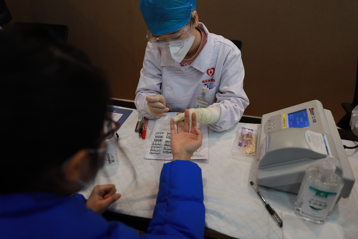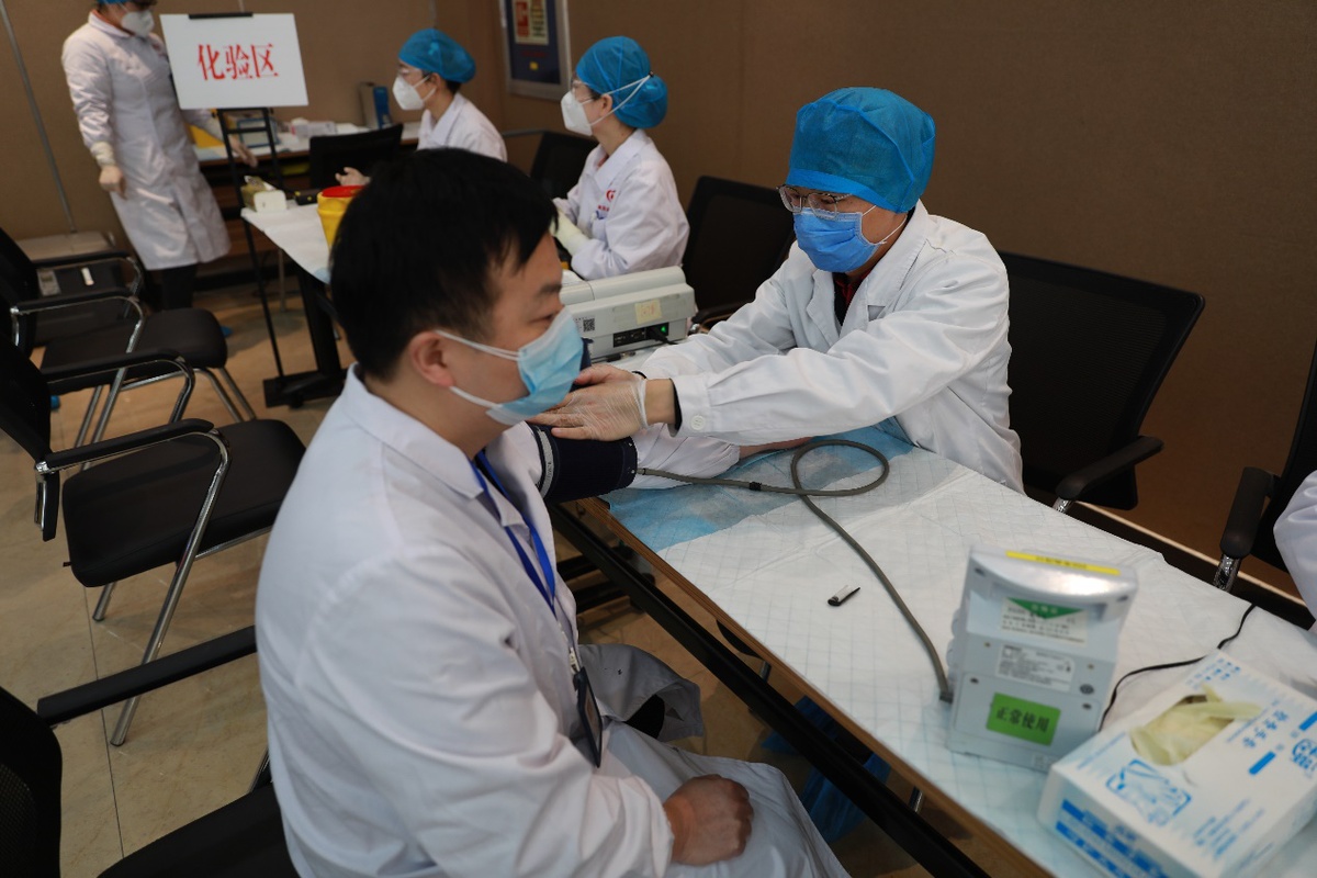 图为医生在为参加献血职工做献血前的相关检查。( 摄影 苏峰)
