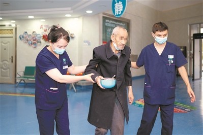 韦广莹(左)与同事在急诊病区搀扶行动不便的患者。