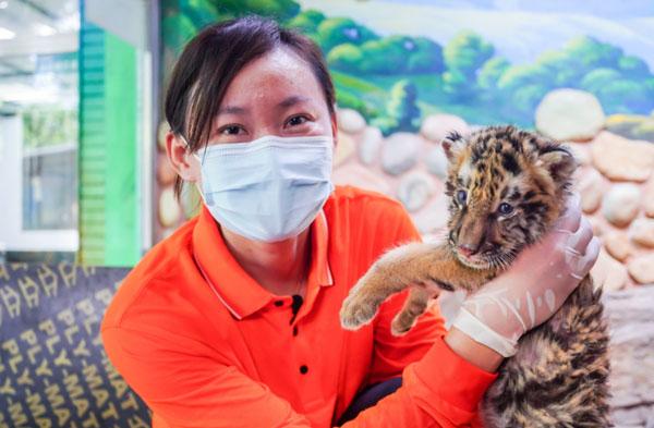 戴上橡胶手套、换上塑胶套鞋、踩过消毒池,钟天使全副武装进入“小动物乐园”,近距离接触刚刚诞生的老虎宝宝。在专业动物保育员的教导下,她学习观察粪便了解小动物的健康情况,亲身实践冲洗动物宿舍、为小老虎洗澡、调配配方奶粉……身上的制服被汗水浸透,她依然一丝不苟地照料着小动物。