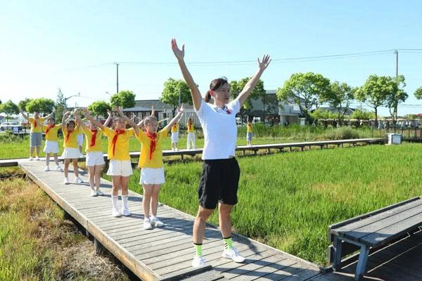 近日,在惠南镇海沈村的田间,奥运冠军钟天使带领镇里的“红领巾”伸展四肢,用元气满满的健身操开启新的一天。