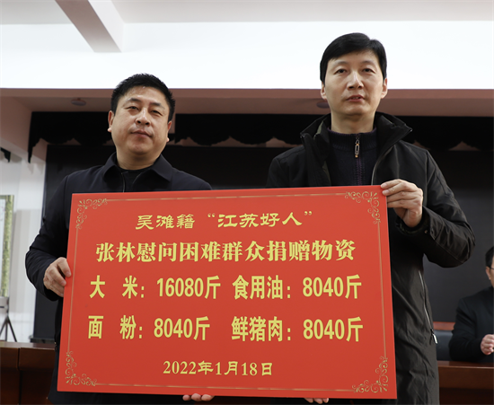 张林虽在苏州工作,但他始终没有忘记家乡。2022年1月10日,张林为阜宁县瑞泰护理院61位老人送去腊八粥、羽绒服、帽子和围巾,为吴滩街道通阳村和合东居委会31户困境家庭送去被子等暖冬物资;1月18日,张林为吴滩街道804户困难群众每户捐赠20斤大米、10斤面粉、10斤食用油和10斤鲜猪肉;6月21日,又向吴滩街道捐赠1380罐米粉和1000箱牛奶;10月2日,第四次回到家乡,向吴滩街道14位百岁老人、陈戴村150位80周岁以上老人送上尊老金和慰问食品礼包,把关爱送到老人心坎上。