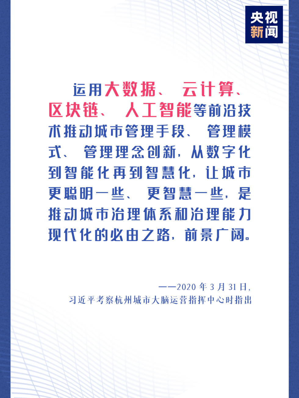3月31日,习近平总书记在杭州城市大脑运营指挥中心考察时指出,要加快建设智慧城市。