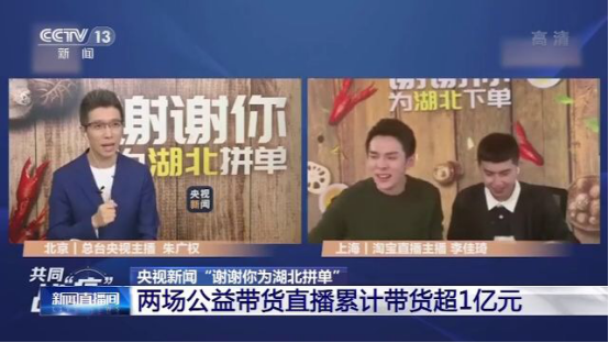 受疫情影响,湖北一些农副产品面临产销积压。央视新闻“谢谢你为湖北拼单”公益行动开播带货直播。4月6日与12日的两场直播,分别卖出价值4014万元和6100万元的湖北产品,助力湖北复工复产。