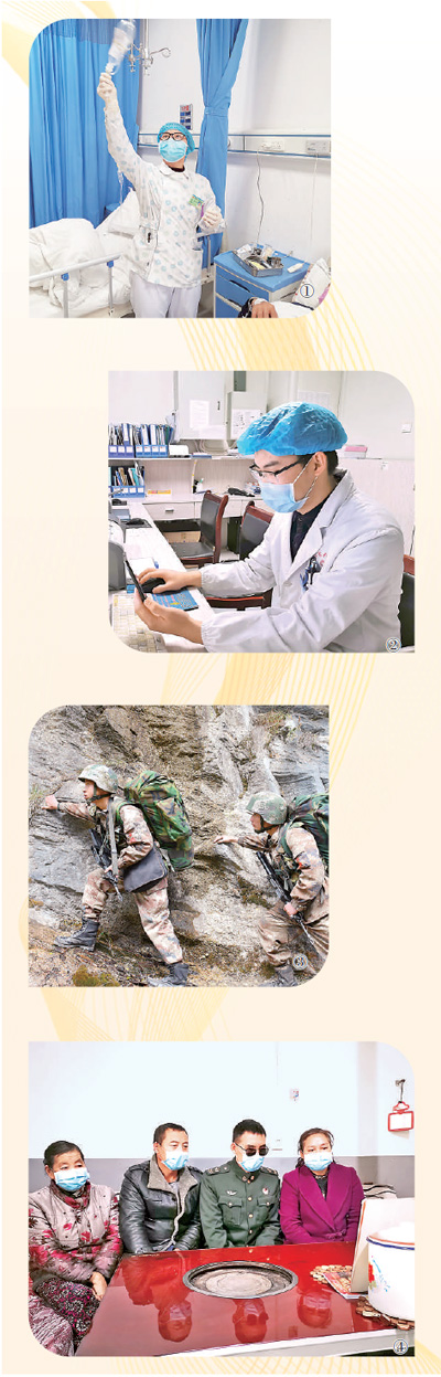 | 图①:支援武汉前,杜富佳在湄潭县人民医院给患者换吊瓶。 仇正腾摄 图②:杜富民在录入患者信息。 马 刚摄 图③:杜富强(左)在参加巡逻。 冯 啸摄 图④:杜富国(左三)与家人在太平村的家中和弟弟妹妹网络连线。 瞿欣含摄 |