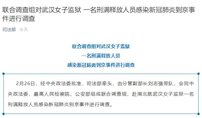 人民网北京2月27日电 (记者孝金波)2月26日,经中央政法委批准,司法部牵头,由分管副部长刘志强带队,会同中央政法委、最高人民检察院、公安部组成联合调查组,赴湖北就武汉女子监狱一名刑满释放人员感染新冠肺炎到京事件进行调查。