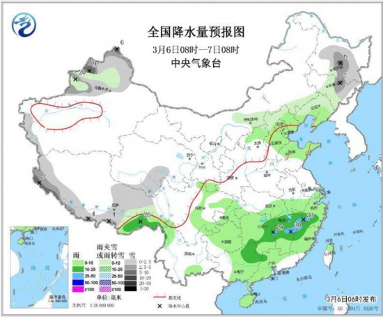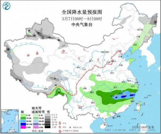中新网3月6日电 据中央气象台网站消息,未来三天,受低层切变线影响,南方地区多阴雨天气。预计,6日夜间至7日早晨,黄淮江汉等地将有大雾天气。 湖南江西海南岛等地出现中雨或大雨 昨日,湖南中部、江西中部、云南东南部、海南岛东部等地出现中雨或大雨,海南岛万宁、琼海局地暴雨(50~74毫米)。 南方地区多阴雨天气 未来三天,受低层切变线影响,南方地区多阴雨天气,其中,江南大部、华南北部等地有中到大雨,局地暴雨,部分地区将伴有雷电等强对流天气;新疆北部、华北北部、东北地区中东部及青藏高原有小到中雪或雨夹雪,局地大到暴雪。 此外,7日夜间至8日夜间,渤海、渤海海峡、黄海西部沿岸、台湾海峡、广东沿岸将有能见度不足1公里的大雾。 黄淮江汉等地将有大雾天气 预计,6日夜间至7日早晨,江汉中东部、江淮西部等地的部分地区将有大雾天气。7日夜间至8日早晨,华北东部、黄淮东部、江淮东部等地的部分地区将有大雾天气。 未来三天具体预报 3月6日08时至7日08时,新疆北部、内蒙古中部、河北北部、东北地区中东部和南部、西藏西部和南部、青海南部等地部分地区有小到中雪或雨夹雪,局地大雪(5~9毫米)。辽宁南部、华北北部和东部、黄淮东部、江淮西部、江南、西南地区东部、华南大部、西藏东南部等地部分地区有小到中雨,局地有大雨(25~30毫米)。内蒙古河套地区和东部、陕西北部、辽东半岛、山东等地部分地区有4~6级风(见图1)。  图1 全国降水量预报图(3月6日08时-7日08时) 3月7日08时至8日08时,新疆北部和南疆盆地西部、东北地区东部、西藏大部、青海南部等地部分地区有小到中雪或雨夹雪,局地大雪或暴雪(10~12毫米)。江南大部、重庆东南部、西藏东南部等地部分地区有中到大雨,局地有暴雨(50~65毫米)。内蒙古中西部、甘肃、陕西北部、云南中部等地部分地区有5~6级风(见图2)。  图2 全国降水量预报图(3月7日08时-8日08时) 3月8日08时至9日08时,东北地区中东部、新疆东部和南疆盆地西部、西北地区中东部、华北北部等地部分地区有小到中雪或雨夹雪,局地大雪(5~9毫米)。江南大部、西藏东南部等地部分地区有中到大雨,局地有暴雨(50~60毫米)。内蒙古、陕西、山西南部、浙江东部、云南中部等地部分地区有4~6级、局地5~7级风(见图3)。  图3 全国降水量预报图(3月8日08时-9日08时) |