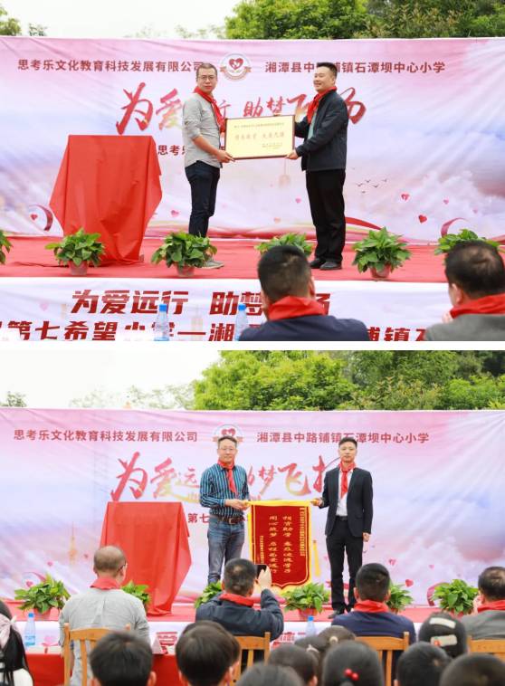 石潭坝中心小学唐淳校长,代表全校师生向思考乐教育集团赠送锦旗和牌匾,“捐资助学,惠及边远学子。同心筑梦,启动为爱远行,”并对此次捐助行动表示感激之情。