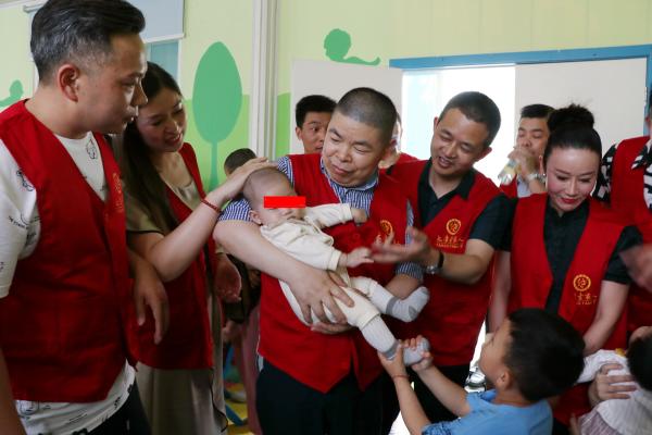 太康万城商贸董事长抱着一名自闭症儿童仔细询问病情