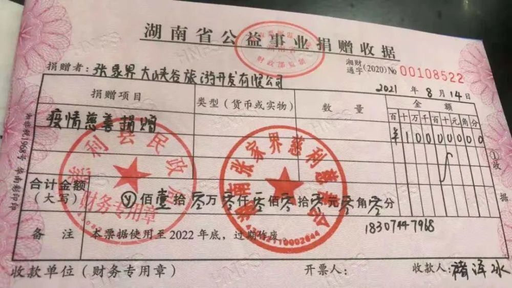 8月16日,张家界大峡谷景区通过张家界市慈善总会和张家界慈利慈善会捐款110万元,助力张家界疫情防控工作。