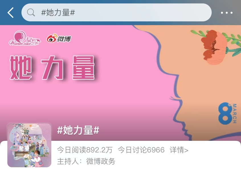该活动是由全国妇联宣传部@全国妇联女性之声、@微博政务 共同发起 #她力量# 活动,携手政务各行业官微、联动多领域大V参与互动,从更多角度展示新时代女性力量和风采。
