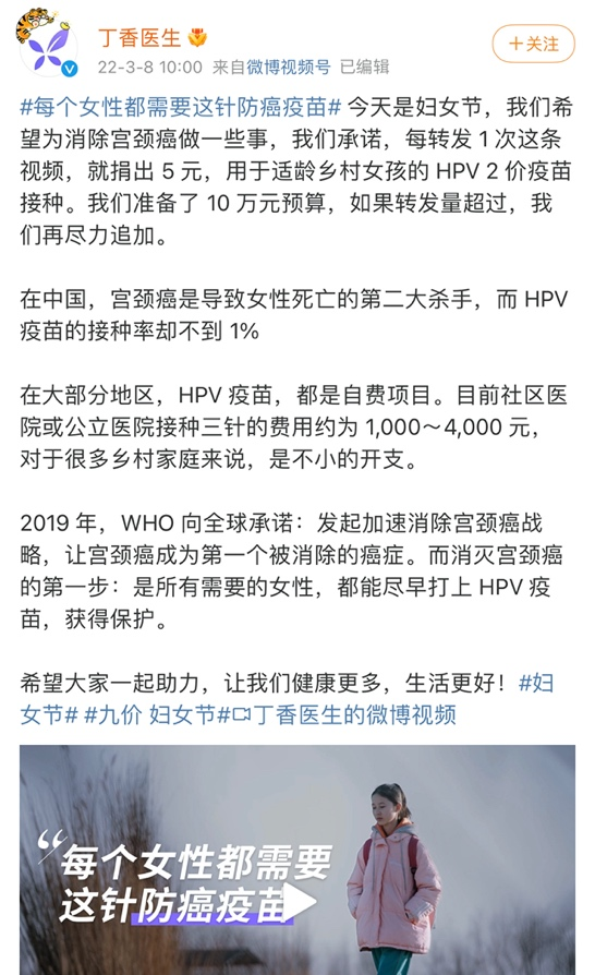 主题:丁香医生发起妇女节公益行动,为乡村女孩免费接种HPV二价疫苗