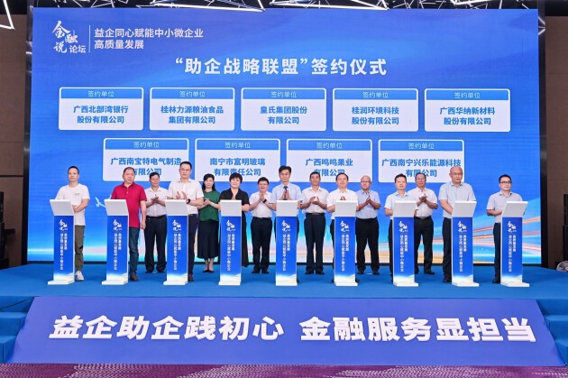 活动倡议成立“助企战略联盟”。“助企战略联盟”倡议由广西企业与企业家联合会、广西北部湾银行共同发起,旨在进一步助力中小微企业纾困解难,有效激发市场活力。目前已有制造业、批发零售、农业、食品工业、建筑业等多领域58家行业龙头企业及中小微企业加入首批联盟。在徐文伟、田宁、卢党红、陈捷、滕仲斌、蒙良等领导嘉宾见证下,广西北部湾银行与桂林力源粮油食品集团有限公司等8家代表企业进行了现场签约。
