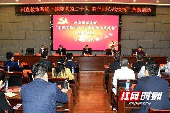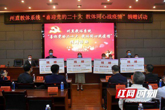 会上宣读了《关于号召全州教体系统广大共产党员共青团员少先队员积极参与疫情防控的倡议书》;州教体局机关全体干部职工、州直教体系统各管理单位主要负责人,以及湖南财信育才保险代理有限公司湘西州分公司、UIB北京联合经纪公司湘西州营业部、湖南佳圆餐饮管理有限公司、湘西自治州大鹏粮油食品有限公司、湘西一叶商贸有限公司、湖南湘西百裕民族服饰有限公司、保靖县更生印刷厂、吉首市民众米粉有限责任公司等爱心企业现场共捐赠现金及口罩、消毒液、酒精等防疫物资共计37.86万元。