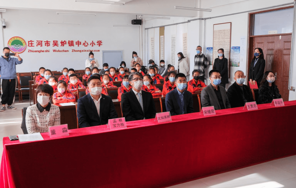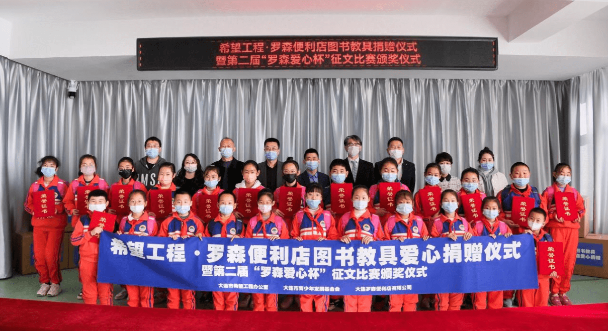 2022年11月8日上午,大连市群团组织综合服务中心所属市希望办、市青基会,在庄河市吴炉镇中心小学举行了希望工程·罗森便利店图书教具捐赠暨第二届“罗森爱心杯”征文比赛颁奖仪式。大连罗森便利店有限公司总经理武知英树、大连市希望工程办公室副主任、大连市青基会理事长宋继君、大连罗森便利店有限公司副总经理董淼、孟根宝力格、庄河市吴炉镇中心小学校长王贯忠、副校长年廷平等出席。