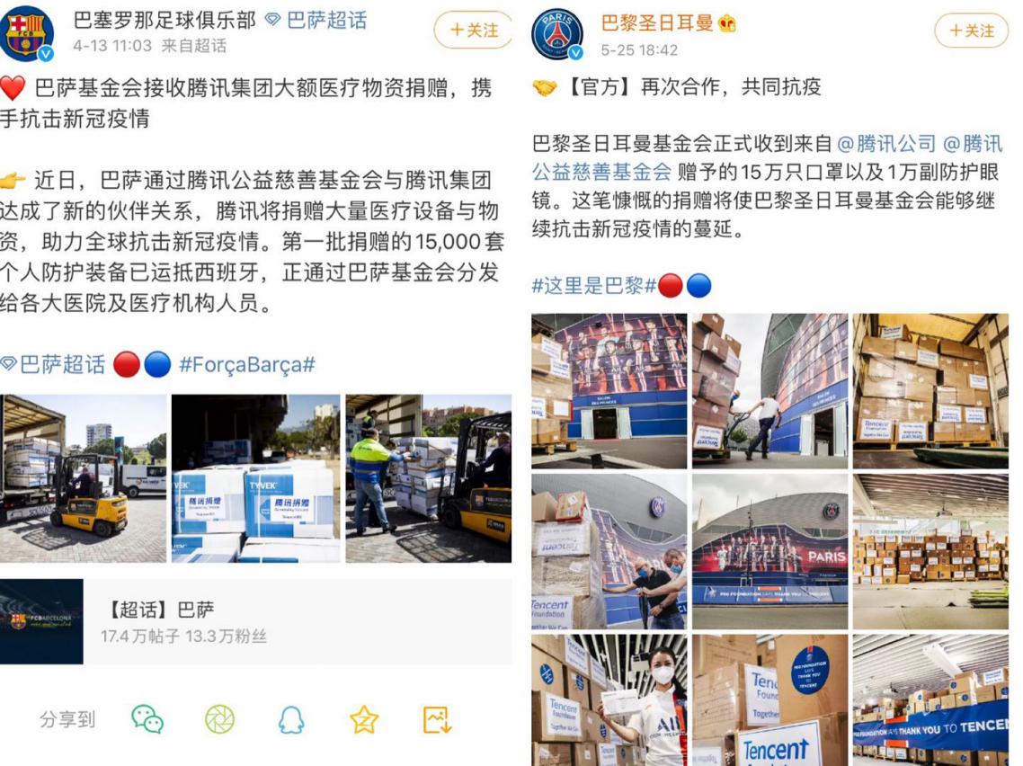 “投我以木桃,报之以琼瑶。”法国巴黎圣日耳曼俱乐部通过社交网站以一首中国诗歌向腾讯表示感谢。上周,15 万只口罩和 1 万个护目镜抵达圣日耳曼队主场王子公园球场,并由巴黎圣日耳曼基金会协助将物资分发给包括反饥饿行动和法国残疾人体育联合会在内的多家慈善组织。5月11日,西班牙巴塞罗那俱乐部也在其社交媒体公开表达感谢,表示腾讯捐赠的防护物资是疫情爆发以来他们收到的捐赠中数量最多的。