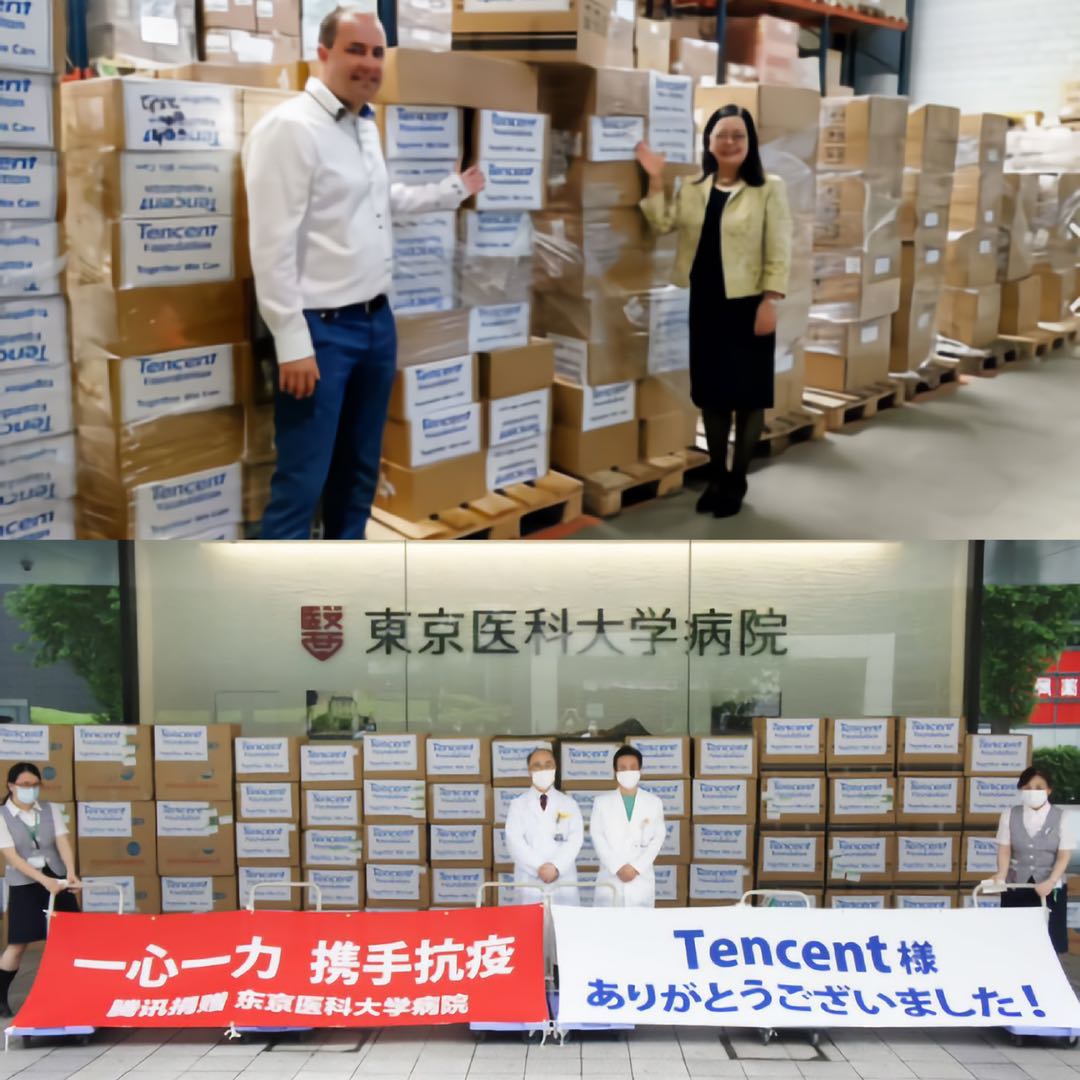 上为腾讯捐赠荷兰伊拉斯姆斯医疗中心的物资下为日本东京医科大学病院致谢腾讯