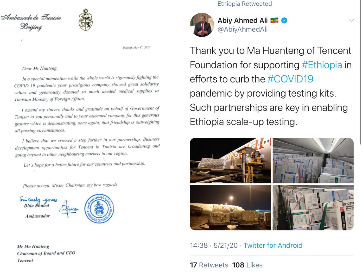 5月21日,中国驻埃塞俄比亚大使在来信中表示,腾讯用实际行动诠释了中埃全面战略合作伙伴的丰富内涵,展现了中国优秀企业家的公益情怀,为促进中埃两国民心相通、共筑更加紧密的中非命运共同体树立了典范。