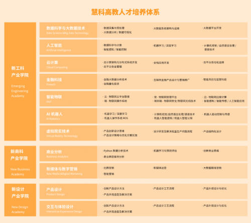慧科集团拥有领先的教育产品和解决方案研发实力,整合了 3,000 多名产学研师资,通过先进的研究方法、实验室等资源将前沿技术转化为教育产品,并率先推出涵盖前沿科技、新商业、创新创业三大领域的 20 多个专业体系。服务覆盖从大学生、初入职场到职场精英的完整职业生命周期,打通从教育入口到出口的可持续发展链条,构建出慧科集团特有的 OMO 教育生态系统。