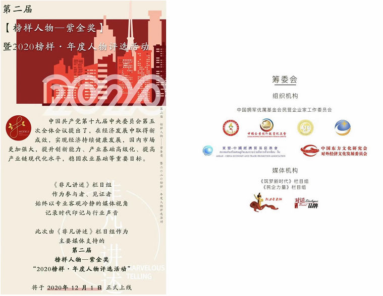 致敬时代楷模,传承榜样精神,由中广世贸(北京)企业管理咨询有限公司承办,东盟经济贸易促进会、民族品牌推广工程组委会、亚洲华人投资总商会、中缅经济合作发展促进会、中国东方文化研究会对外经济文化发展委员会、中国企业对外投资促进会、中国拥军优属基金会民营企业家工作委员会协办的【榜样人物—紫金奖】评选活动10月1日正式上线,坚持层层举荐、全媒传播,同时进行全国活动投票,在全网宣传树立了一批事迹感人的榜样人物,历经一个月时间,最终由组委会审定名单,公布并召开颁奖仪式。昨日,45名【榜样人物】获奖名单出炉,15家企业及个人为楷模榜样、20家企业及个人为公益榜样、10家企业为品牌榜样,获奖选手及企业覆盖了各个群体、各行各业。