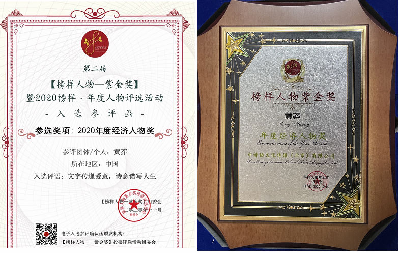 【榜样人物——紫金奖】通过宣传每一位榜样的正能量,在公众面前起到带头作用,从而将中华传统美德继续发扬光大。而这次活动共有两类参选单位,个人、企业或组织团体,其中个人参选的奖项有:“公益”榜样和“楷模”榜样,企业或组织团体参选的奖项有:“品牌”榜样、“公益”榜样和“楷模”榜样。经过投票遴选活动,著名诗人、中诗协董事会主席黄莽荣获2020年度【榜样人物——紫金奖】年度经济人物。一共获得二十四万九百零九票,以及八十二万八千四百五六个人的支持和关注。