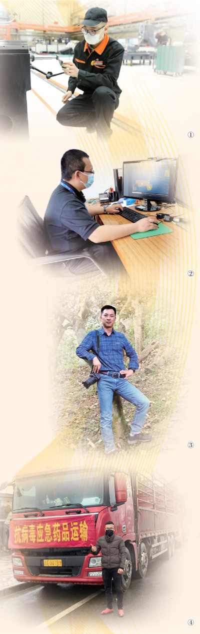 | 图①:张晶在生产线上操作机器。 本报记者 王汉超摄 图②:高山坐在办公室里调试软件。 资料图片 图③:余世刚上山准备采茶。 资料图片 图④:尹涛涛出发前和自己的货车合影。 资料图片 版式设计:汪哲平 |