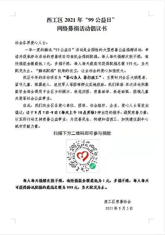9月6日,西工区召开2021年“99公益日”活动动员大会,号召全区各爱心单位、团体、社会组织、企业、爱心人士等伸出援手,凝聚慈善力量,以实际行动支持慈善公益事业,为改善民生、构建和谐西工、加快建设副中心城市贡献力量。