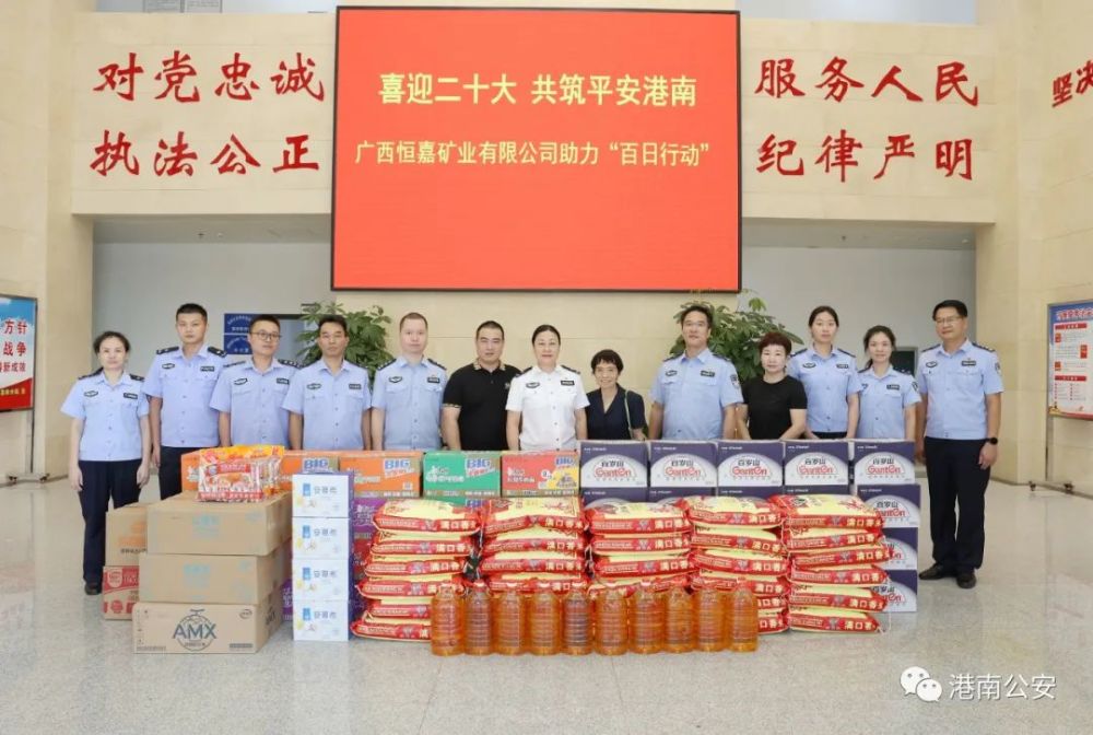 8月23日上午,广西恒嘉矿业有限公司到港南公安分局开展夏季治安打击整治“百日行动”慰问活动,并给一线民警送来了油、米、牛奶等慰问品。港南区副区长、公安分局党委书记、局长陈秋玲出席活动。