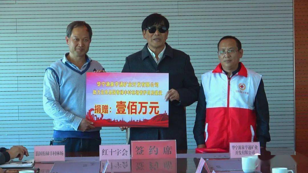 11月15日,华宁源泉亨通矿业开发有限公司向宜良县红十字会捐赠100万善款,建设国有禄丰村林场管护用房,提升林场森林资源管护能力、改善林区管护人员生产生活条件。