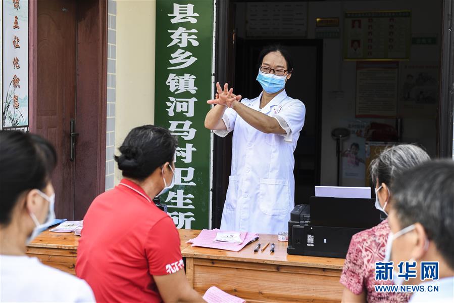 江凤英给东乡镇河马村村民讲解科学的洗手方法。新华社记者 曹祎铭 摄