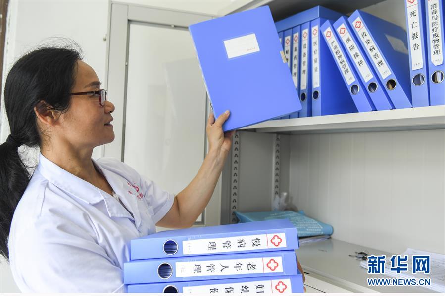 在东乡镇河马村卫生所,江凤英在整理村民们的健康档案。