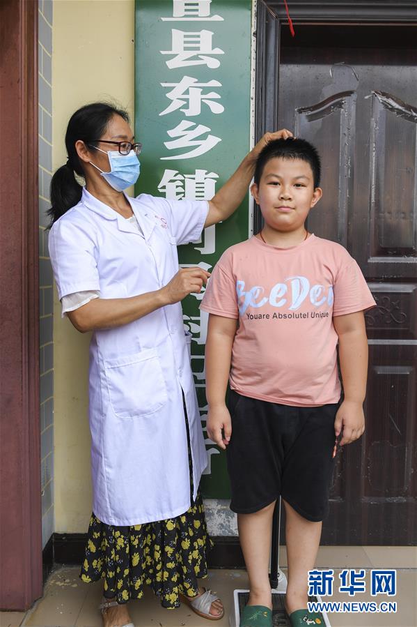 在东乡镇河马村卫生所,江凤英给村里的儿童测量身高体重。