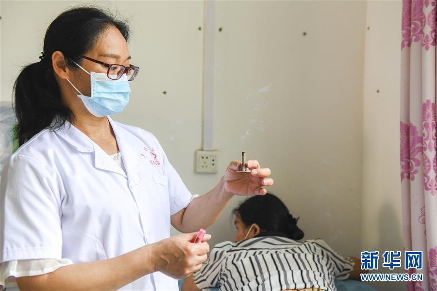 在东乡镇河马村卫生所,江凤英给村民进行艾灸治疗。