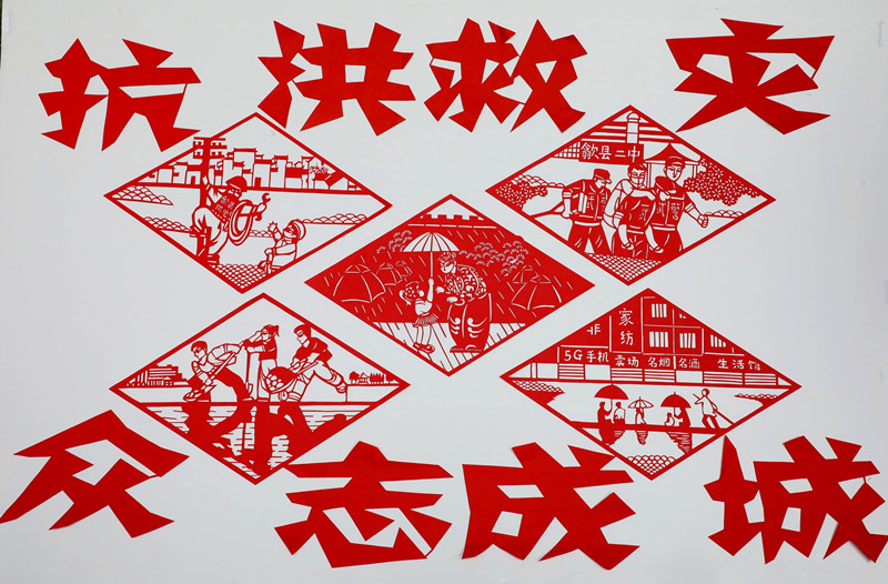 在黄山市歙县,“中国好人”吴笑梅将感人画面一幅幅记录下来,精心设计,用剪纸的形式展示了万众一心、众志成城的抗洪抢险精神。吴笑梅表示,希望通过剪纸这一种方式,传递向上正能量。(程薇 王振龙)