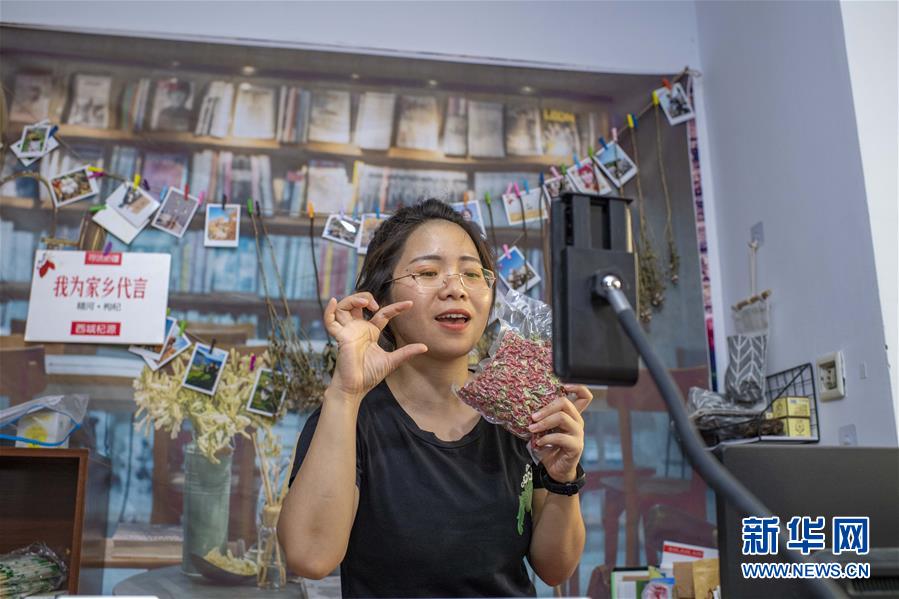 在位于新疆精河县城的工作室内,朱虹美通过手机向网友介绍真空包装的枸杞产品(7月11日摄)。 新华社记者 胡虎虎 摄