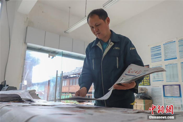 张林昌在代办点整理报刊,这是他每天的常规工作。中新社发 瞿宏伦 摄