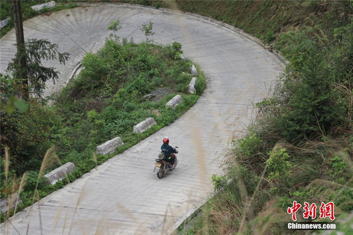 张林昌骑着摩托车行驶在曲折的山路上。中新社发 瞿宏伦 摄