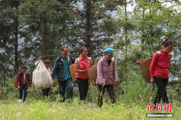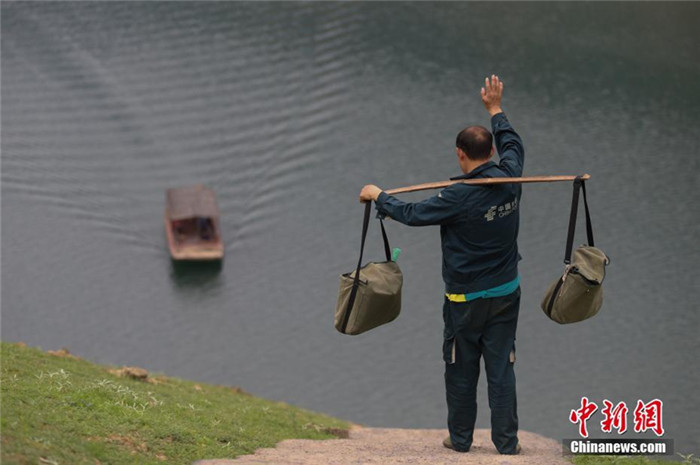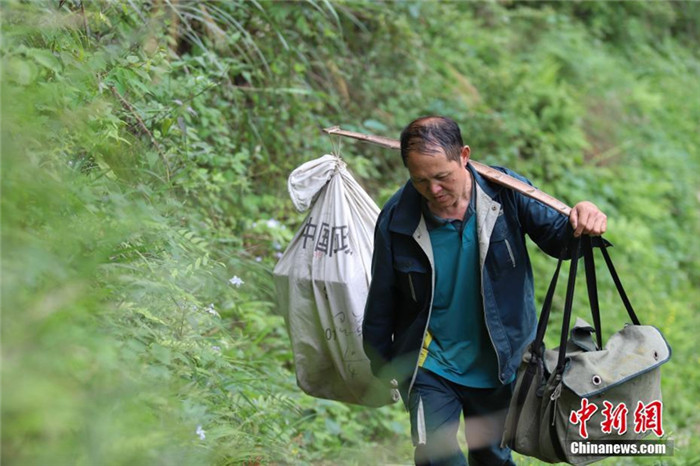 张林昌送邮件到深山中遇到村民下山赶集返回。中新社发 瞿宏伦 摄