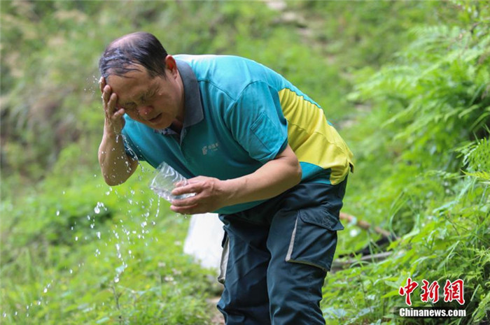 行走在山林间,张林昌用山泉洗脸。中新社发 瞿宏伦 摄